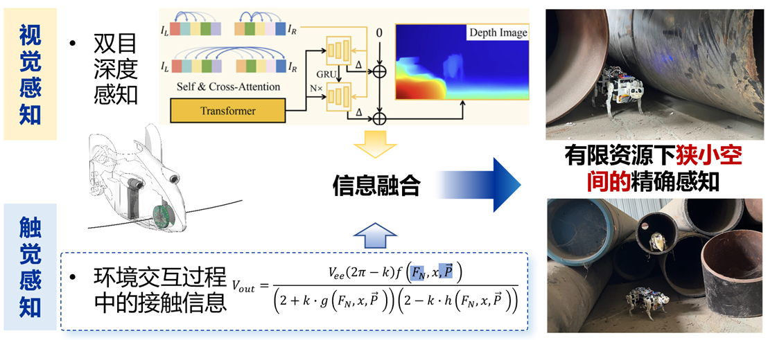 2)多维微型感知融合:提出了机器人化感知器件精密制作方法,构建了仿生柔性微触须单元,解决了低光照环境下感知能力弱的难题;提出了仿生视觉深度估计和仿生触觉轮廓重建方法,实现了对复杂场景下基于视触融合的高精度感知与精确定位,为微小型仿生机器人智能决策提供重要支撑;创建了视、触与听觉多维感知系统,解决了基于多目标检测算法的实时位姿估计与动物交互行为识别难题,为机器人环境理解提供支撑。相关研究成果在美国国家科学院院刊PNAS(2024, 121:e2320386121),机电一体化领域顶级期刊IEEE/ASME Transactions on Mechatronics、Biosensors and Bioelectronics、IEEE Robotics & Automation Magazine 等发表学术论文17篇。获机器人领域国际会议IEEE ICRA 2021(机器人领域TOP1)、IEEE RCAR 2020、IEEE ICIUS 2019优秀论文奖。