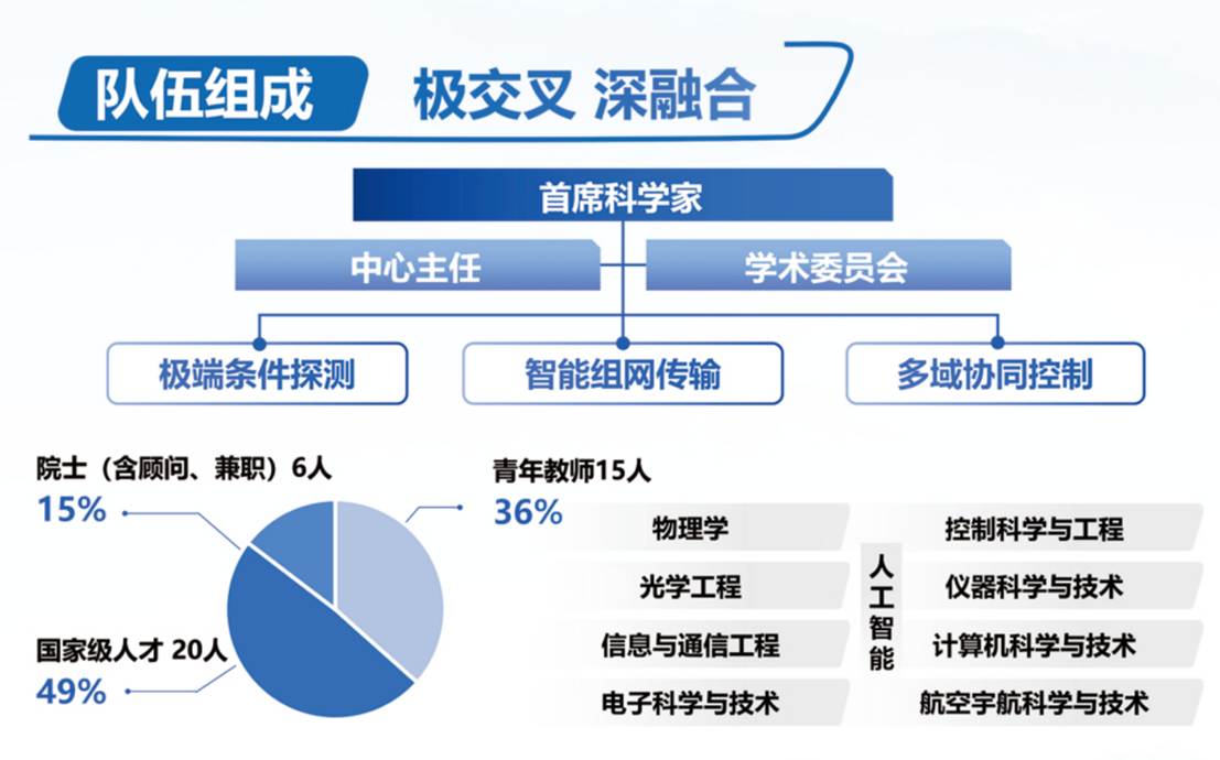 中心秉承“报国担当、知微见著、交叉协同、创新卓越”的团队精神,坚定地推动航空强国、网络强国和制造强国建设进程,持续瞄准深空探测、临近空间网络、载人航天、未来作战等国家重大战略需求,重点围绕极端条件探测、协同组网传输、多域智能控制等前沿技术领域,建设国家重大科技基础设施、新兴交叉学科机构和创新人才培养基地。