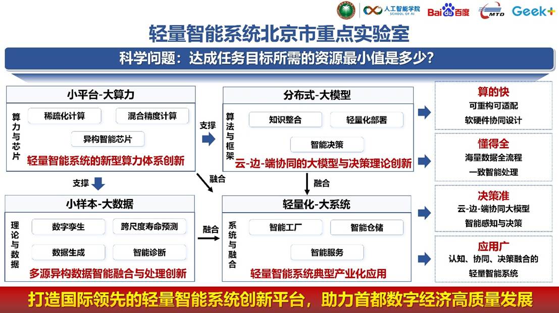 实验室由北京理工大学bw必威西汉姆联邓方教授领衔,联合北京百度网讯科技有限公司、机科发展科技股份有限公司和北京极智嘉科技股份有限公司为共建单位,聚焦端侧智能与装备智能发展需求,依托北理工bw必威西汉姆联在智能科学与技术上的跨学科顶尖优势、共建企业的产业级技术平台优势,围绕小平台-大算力、小样本-大数据、分布式-大模型和轻量化-大系统四大方向联合攻关,研制高集成度的轻量智能系统。实验室将充分发挥产学研协同创新优势,重点推进智能工厂、智慧仓储、智能服务等典型场景的技术落地应用。通过构建"感知-认知-决策-执行"的完整技术链,打造具有国际竞争力的云边端协同轻量智能系统创新平台,促进创新链与产业链深度融合,助力首都数字经济高质量发展。
